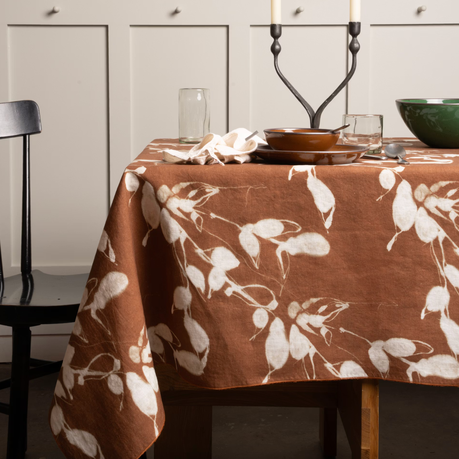Plum and ochre are very Thanksgiving-y as a color palette, and yet I don't think we're making use of this duo nearly enough during the festive season. Pomegranate, as always, has a whole host of beautiful and richly layered prints to choose from, all hand-block-printed in India on 100% cotton—you'll have trouble choosing if you browse for more than a few minutes. But let me just say this: how gorgeous would this particular print be with some cranberry-hued ceramics set out across the table? Very gorgeous indeed. (Note: my recommendation of this tablecloth has nothing to do with the fact that it's shown above with basically the same Murano glass tumblers I happen to own...but hey, game recognize game.) I'll also shamelessly note that I think some Bordeaux-toned tapers, like those we recently added to the shop at HEALER, would pair nicely here.