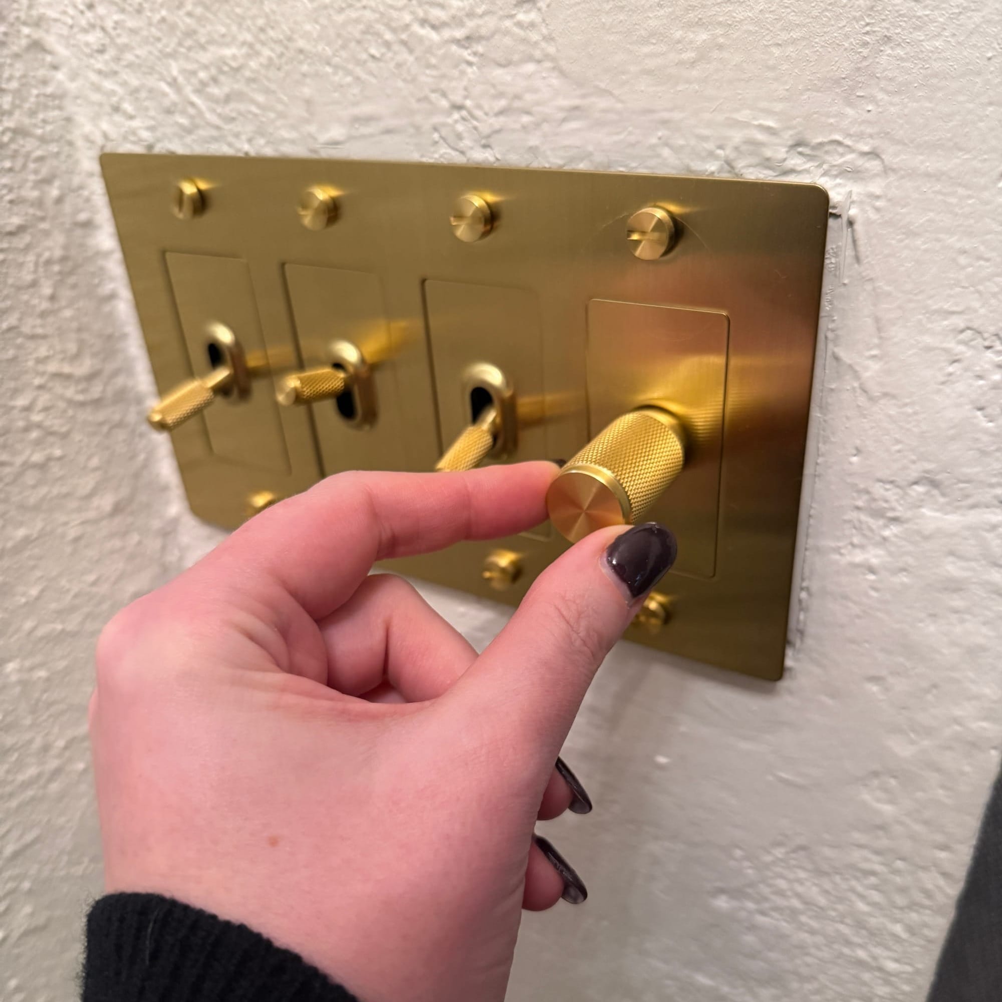 The brand's signature knurled finish, which feels motorcycle-shop-but-like-somehow-fancy, was what originally caught my eye. But the ability to truly "build your own" 4-gang switch was a major novelty as well. Adding a dimmer felt like the right choice for my unrelenting overhead light, even though it doesn't make as exciting of a thwack! sound as the flipper-switches do. If the whole motorcycle-shop-chic vibe isn't your jam, there are some more classical styles I'm considering for my next project at NalataNalata, deVOL Kitchens, and Dowsing&Reynolds. (Why do UK brands seem to be cornering the market on interesting switches? I do not know.)
